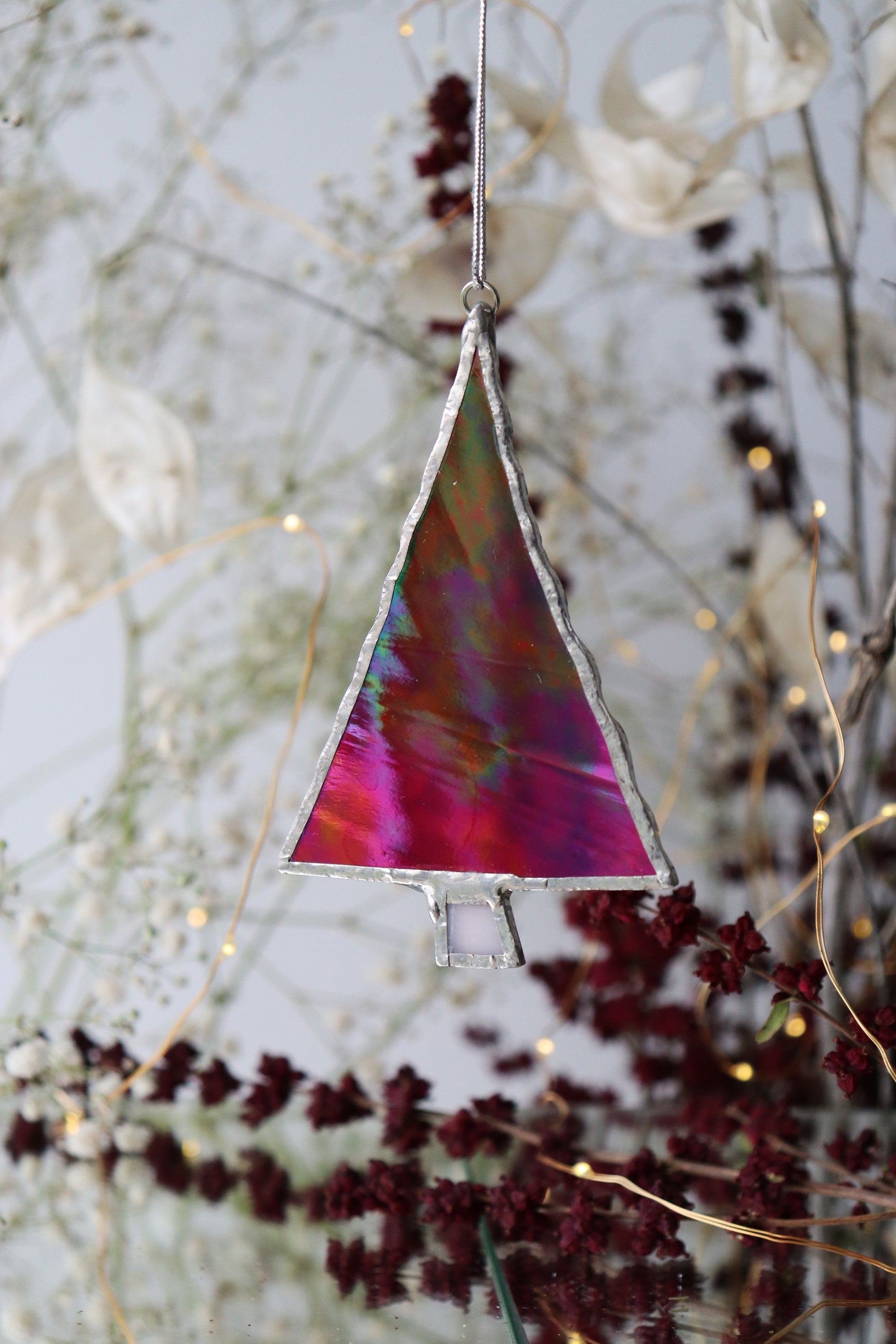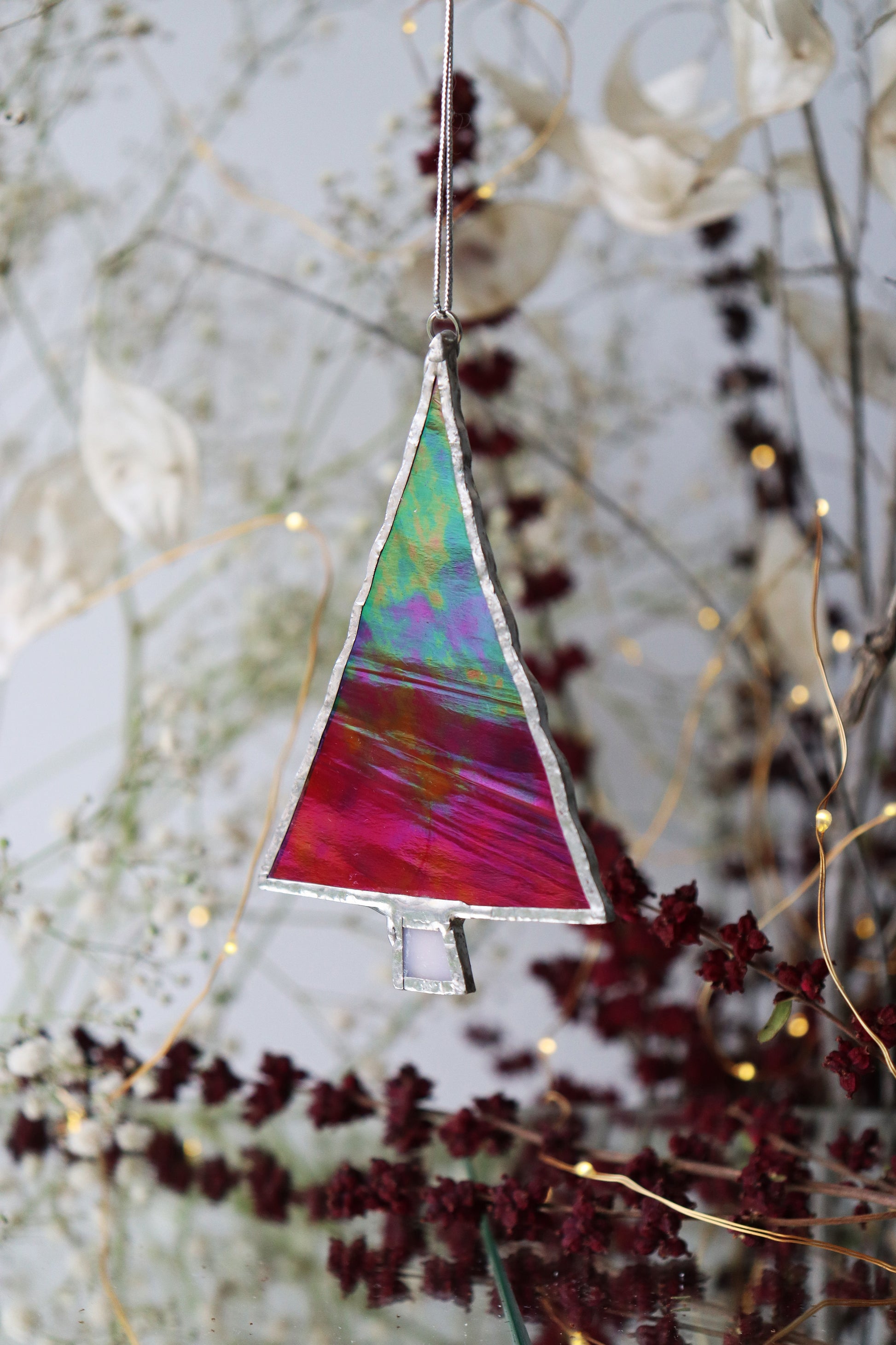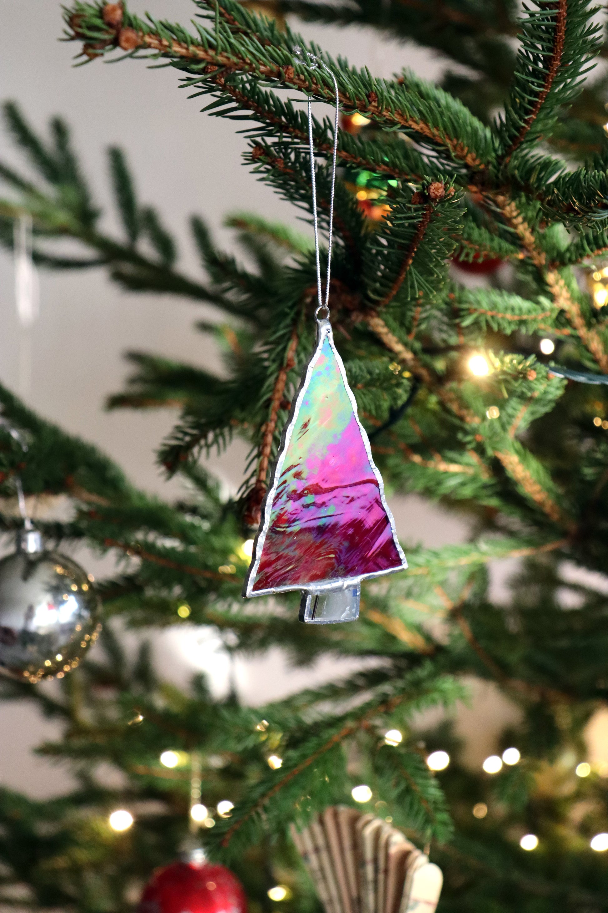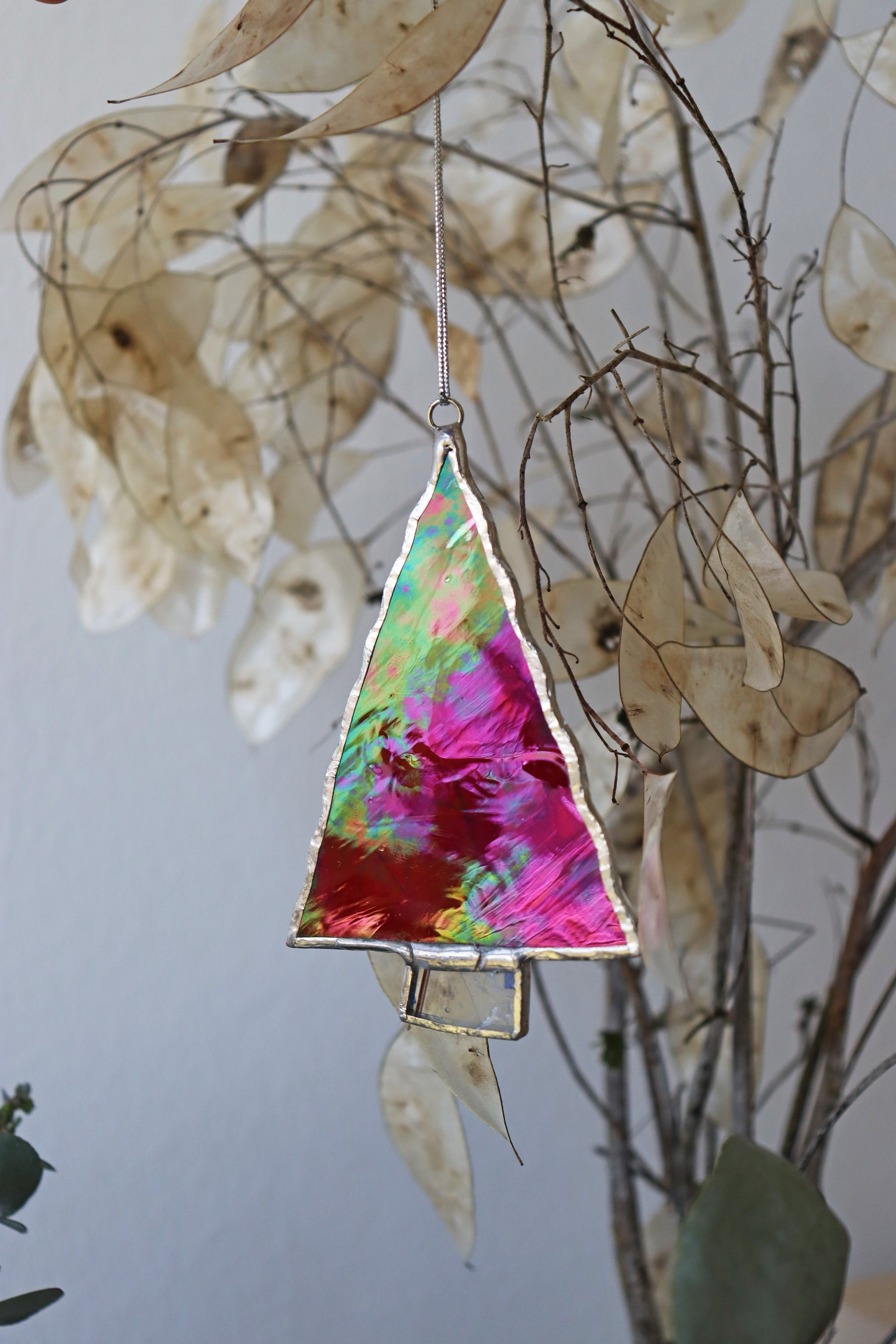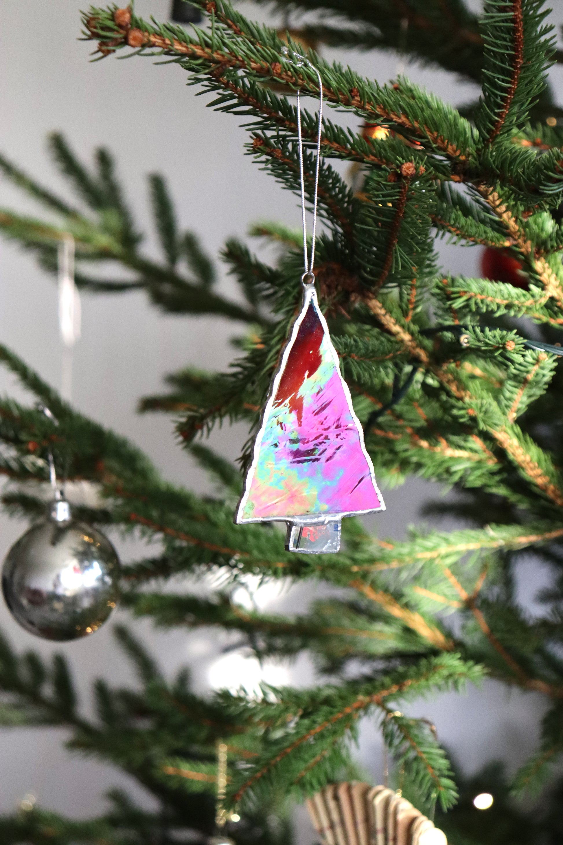 Ornaments are made with iridescent glass. It's iridescent on one side and red or pink on the other