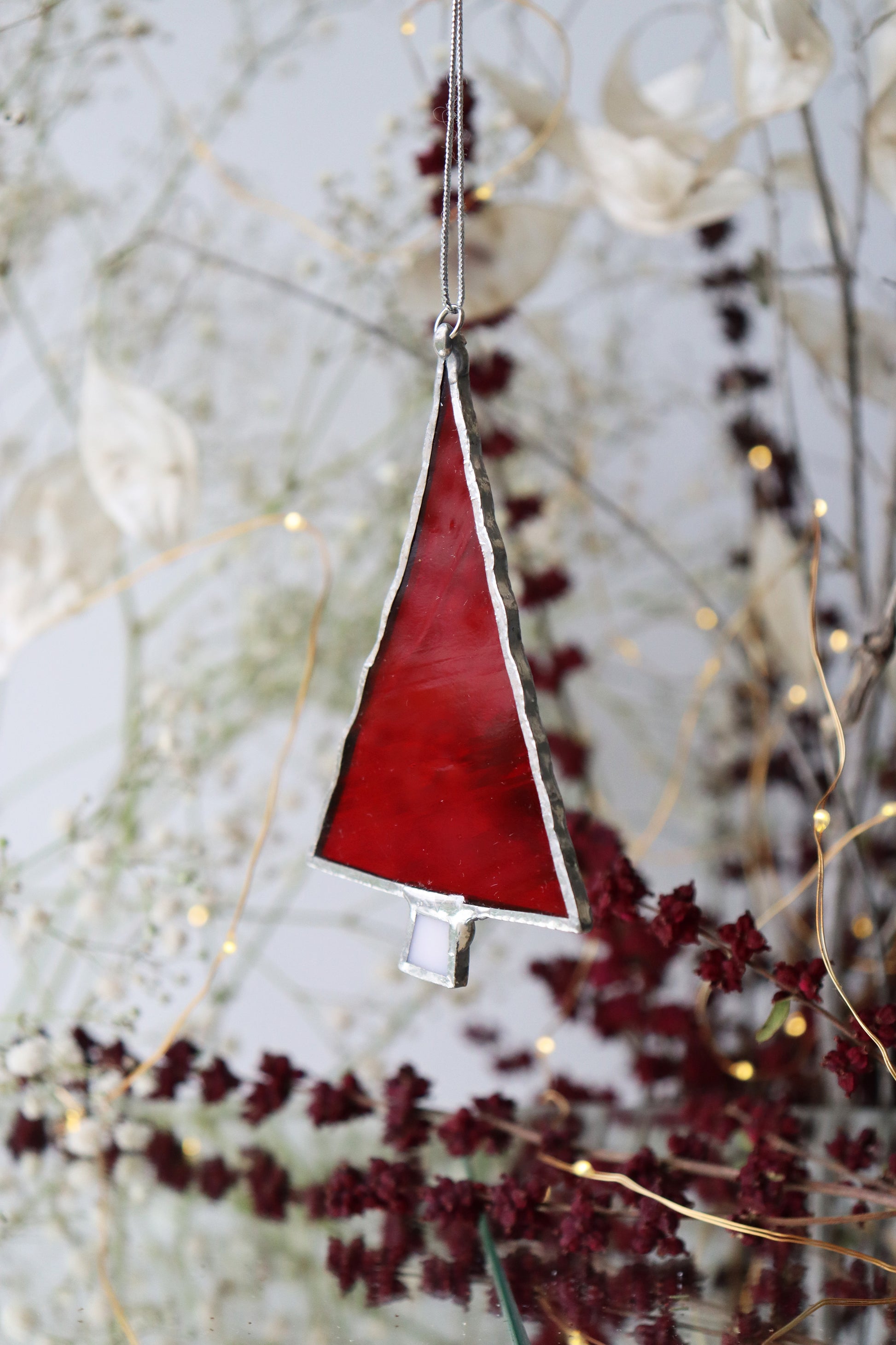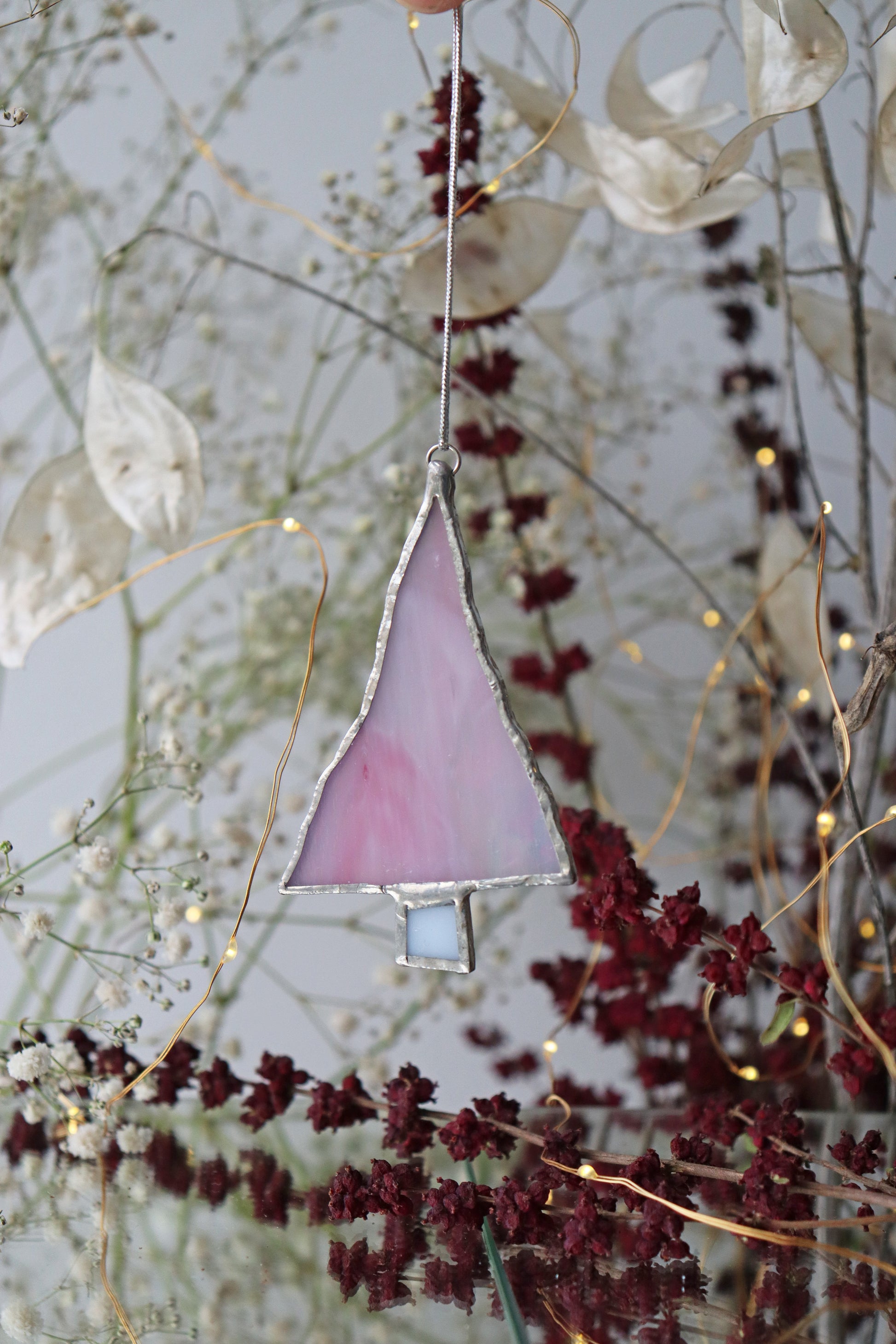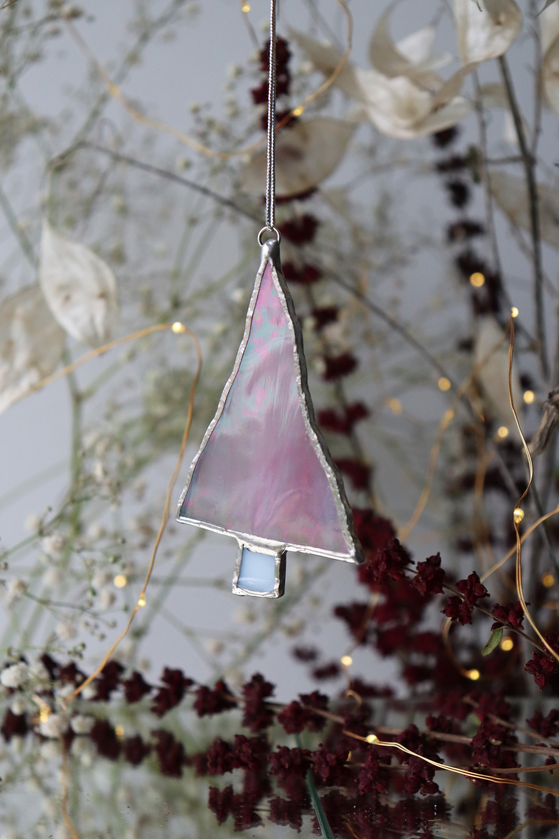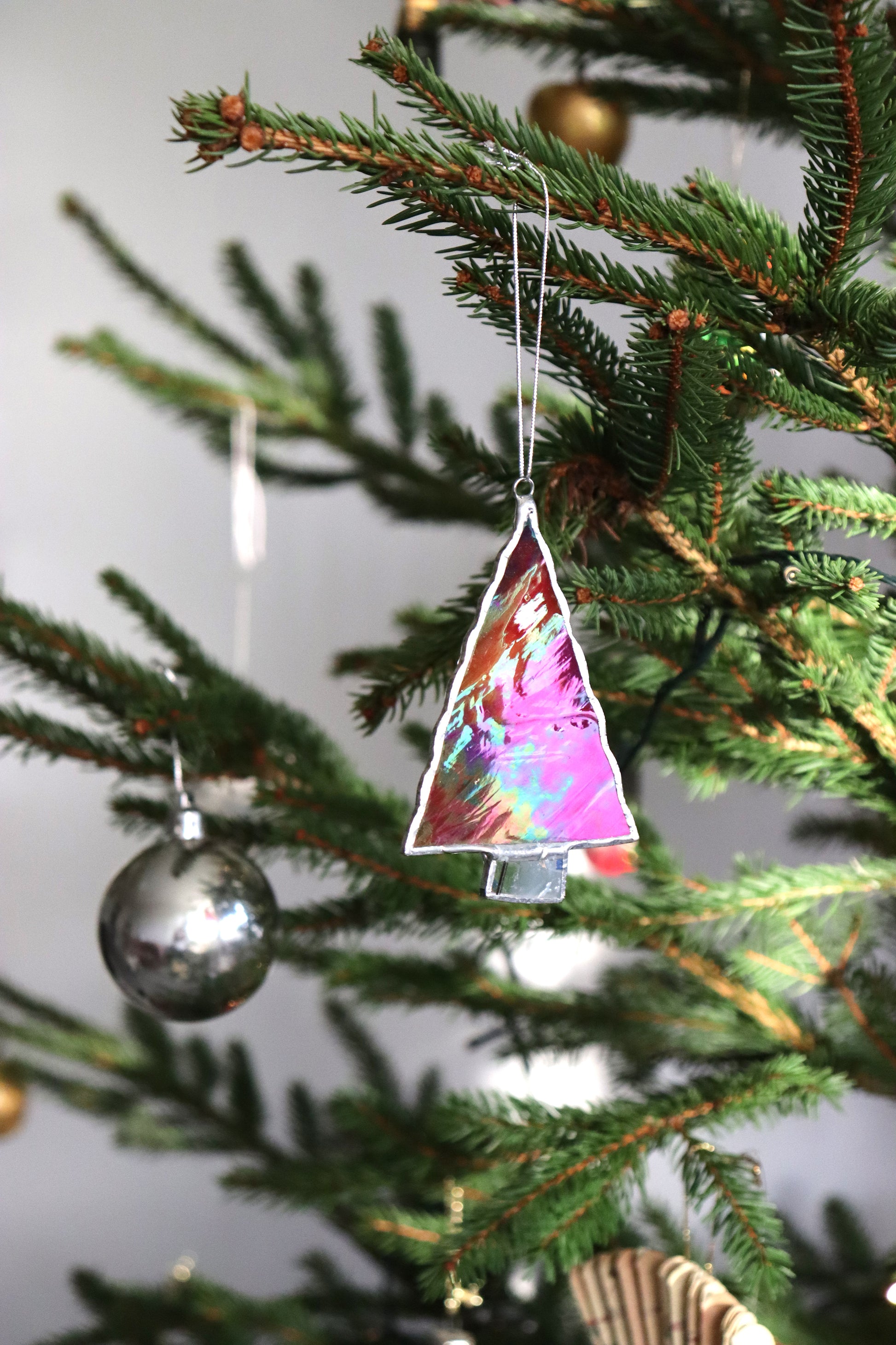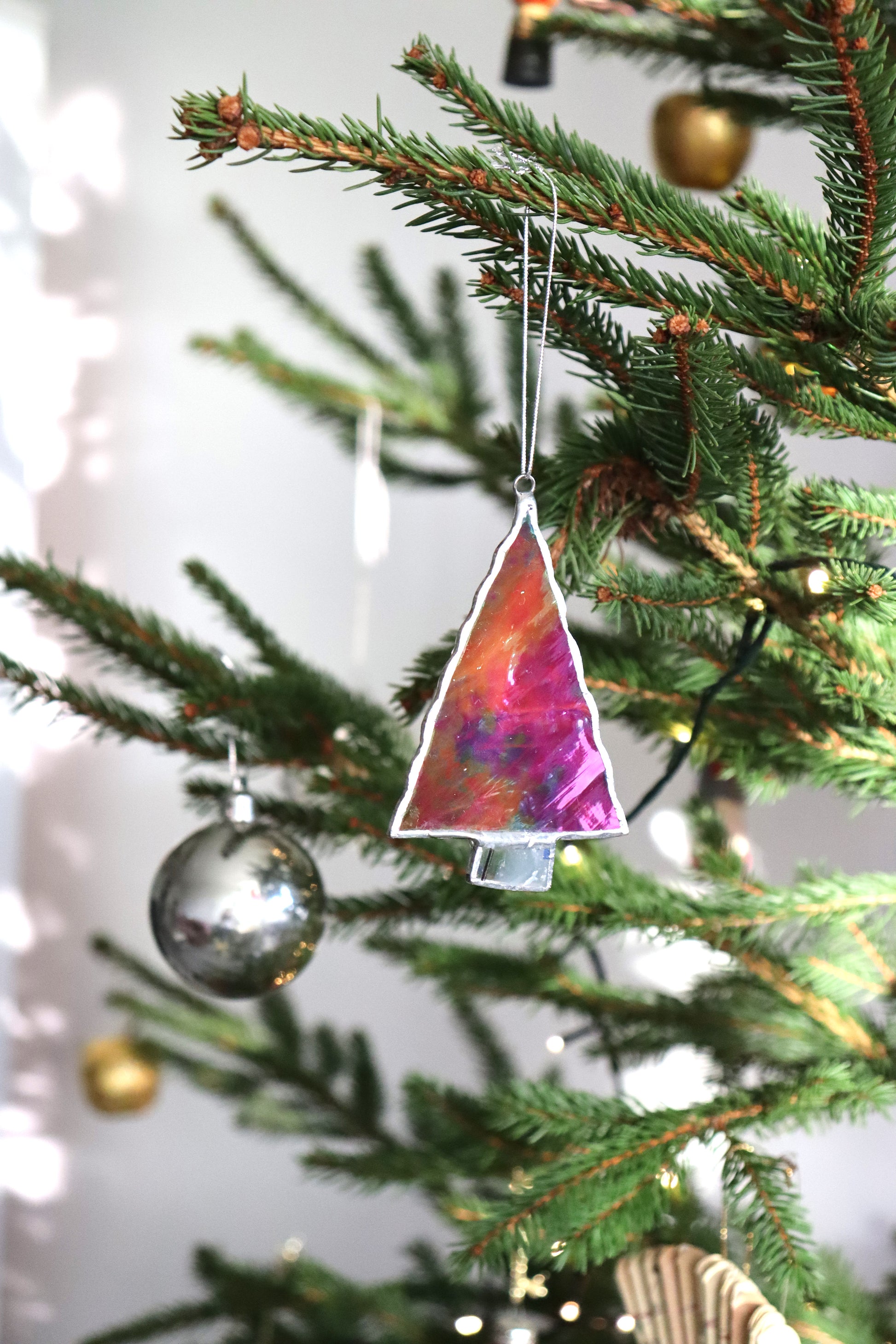 Ornaments are made with iridescent glass. It's iridescent on one side and red or pink on the other