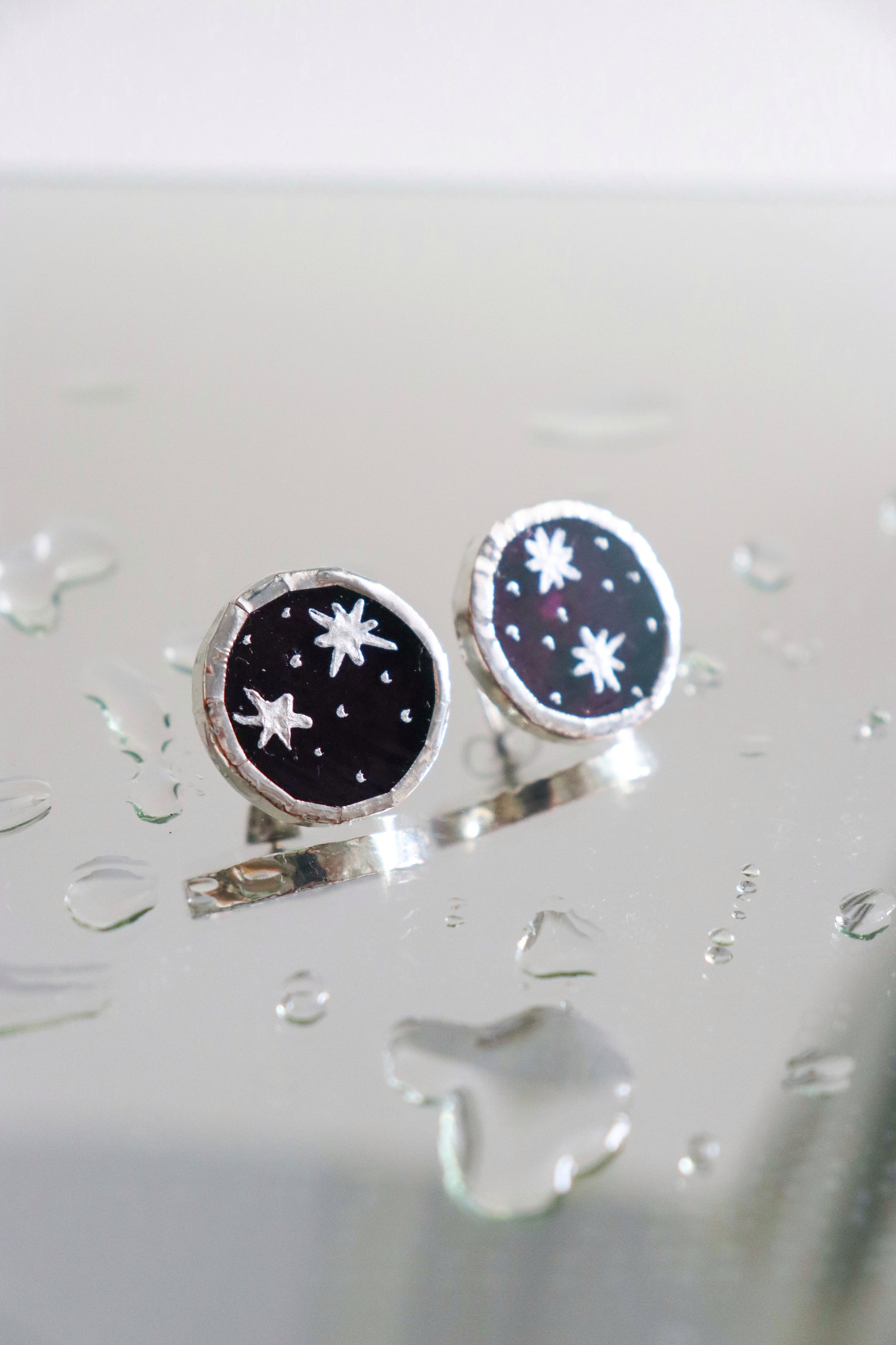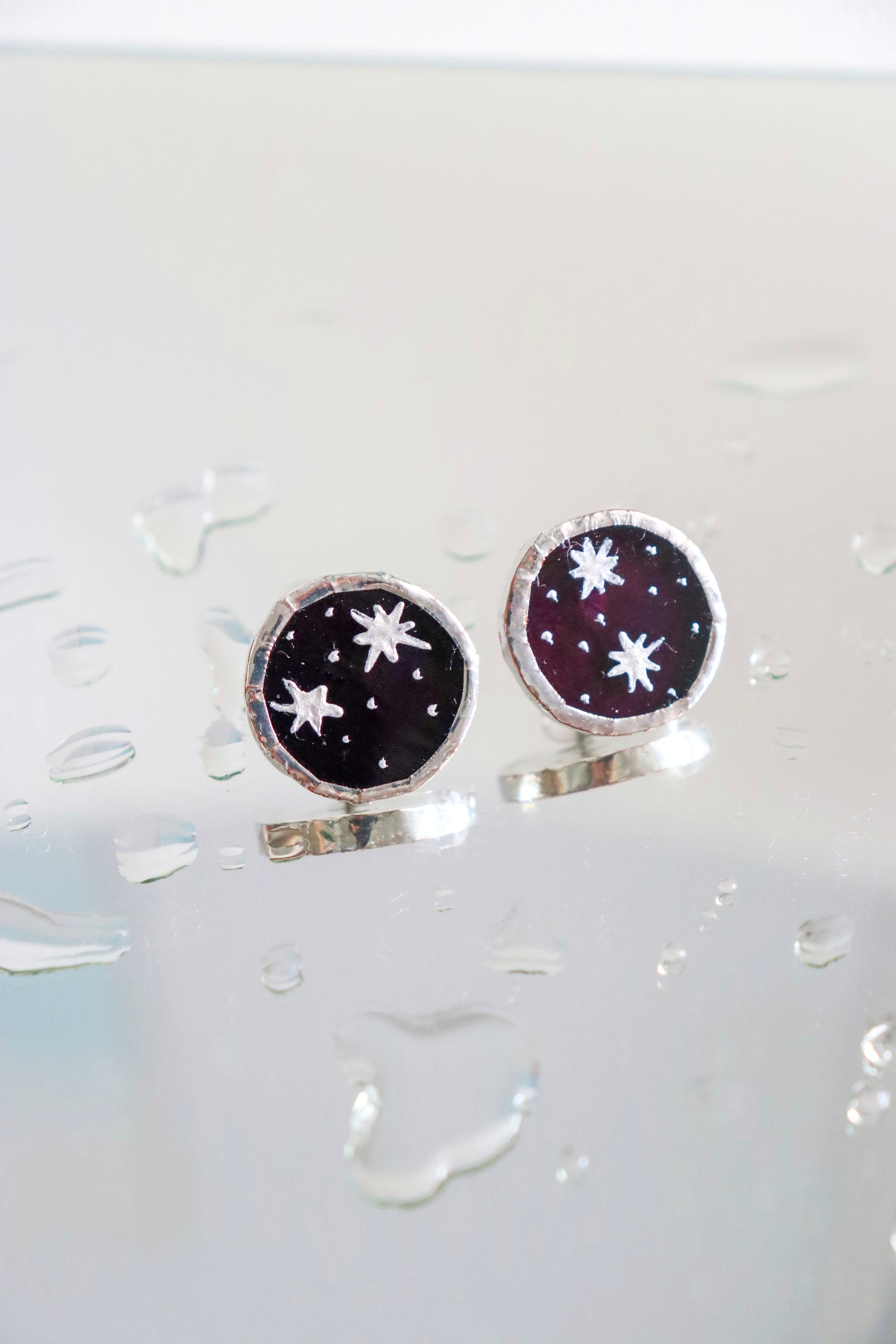 Elegant circle earrings handcrafted from quality glass in a deep purple color and hand painted with glass paint
