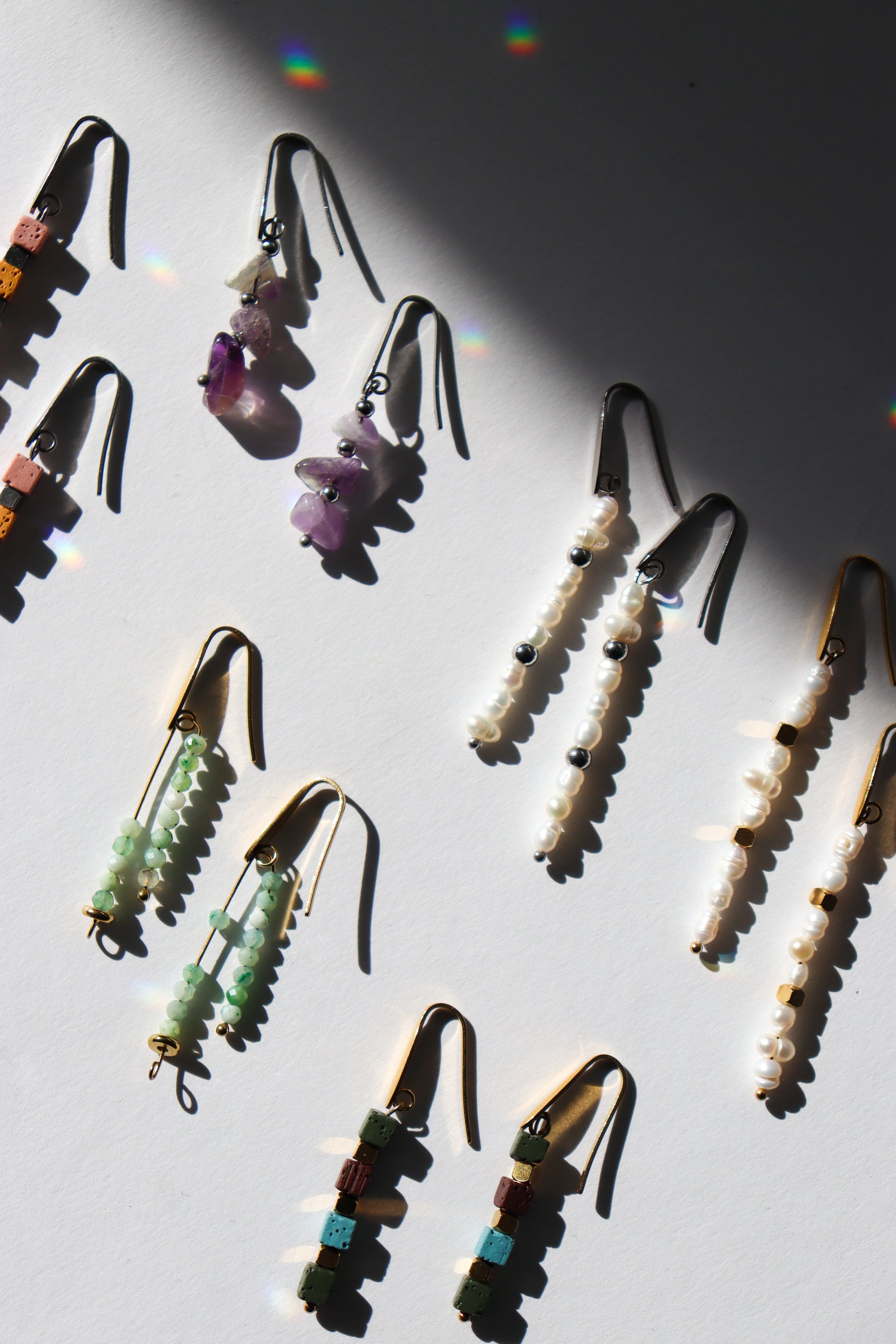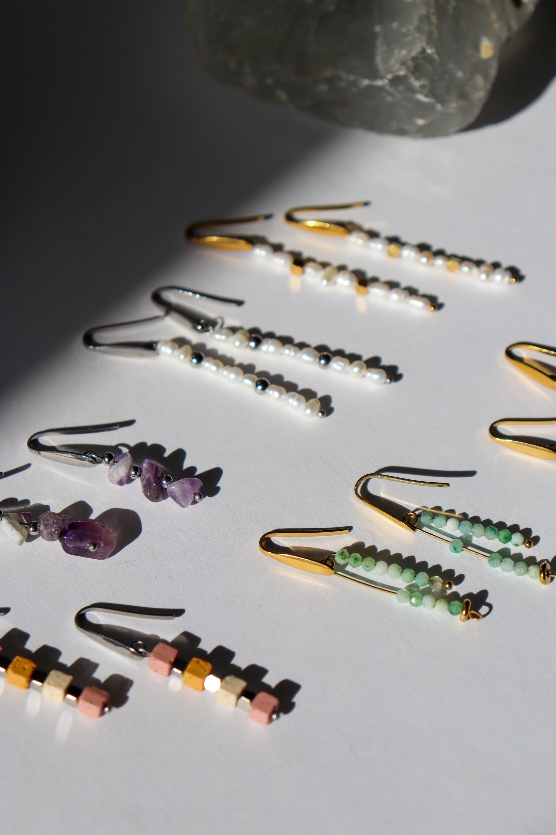 Different semi-precious stones and sweetwater pearls on stainless steel or mixed with copper wire