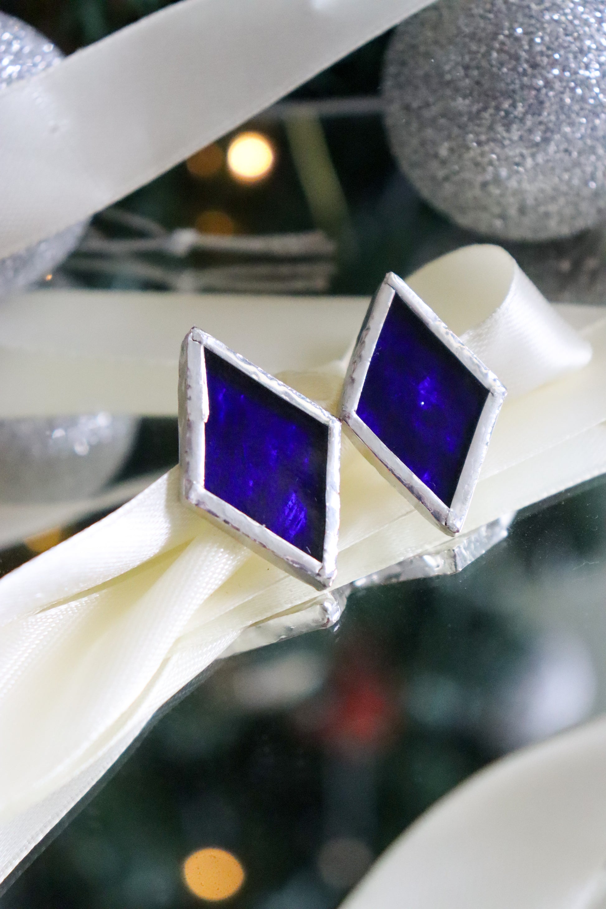 Glass is covered in lead-free solder with nickel free metal earring posts and butterfly backing