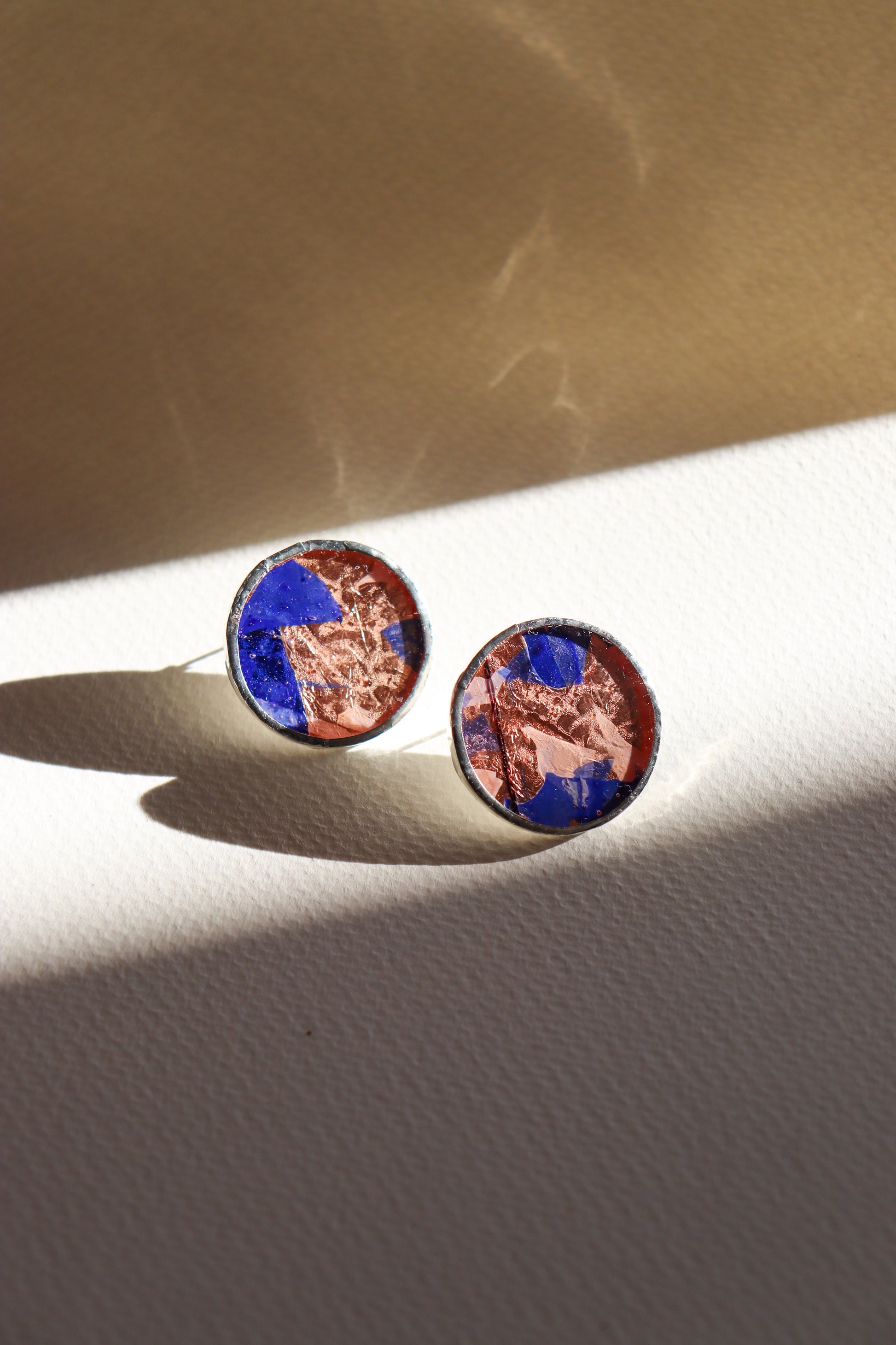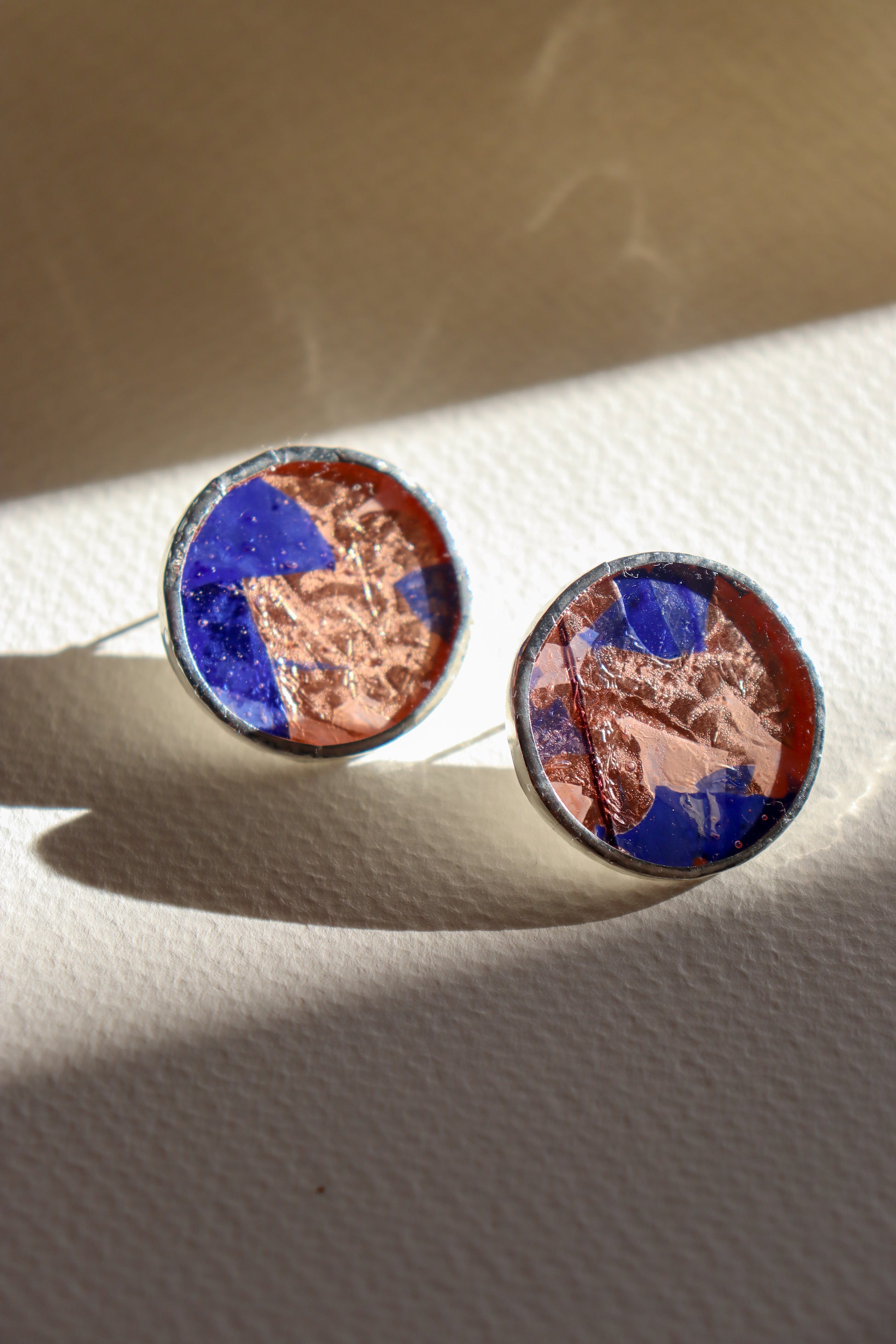 Elegant circle earrings handcrafted from quality glass in a copper and blue combination of color.