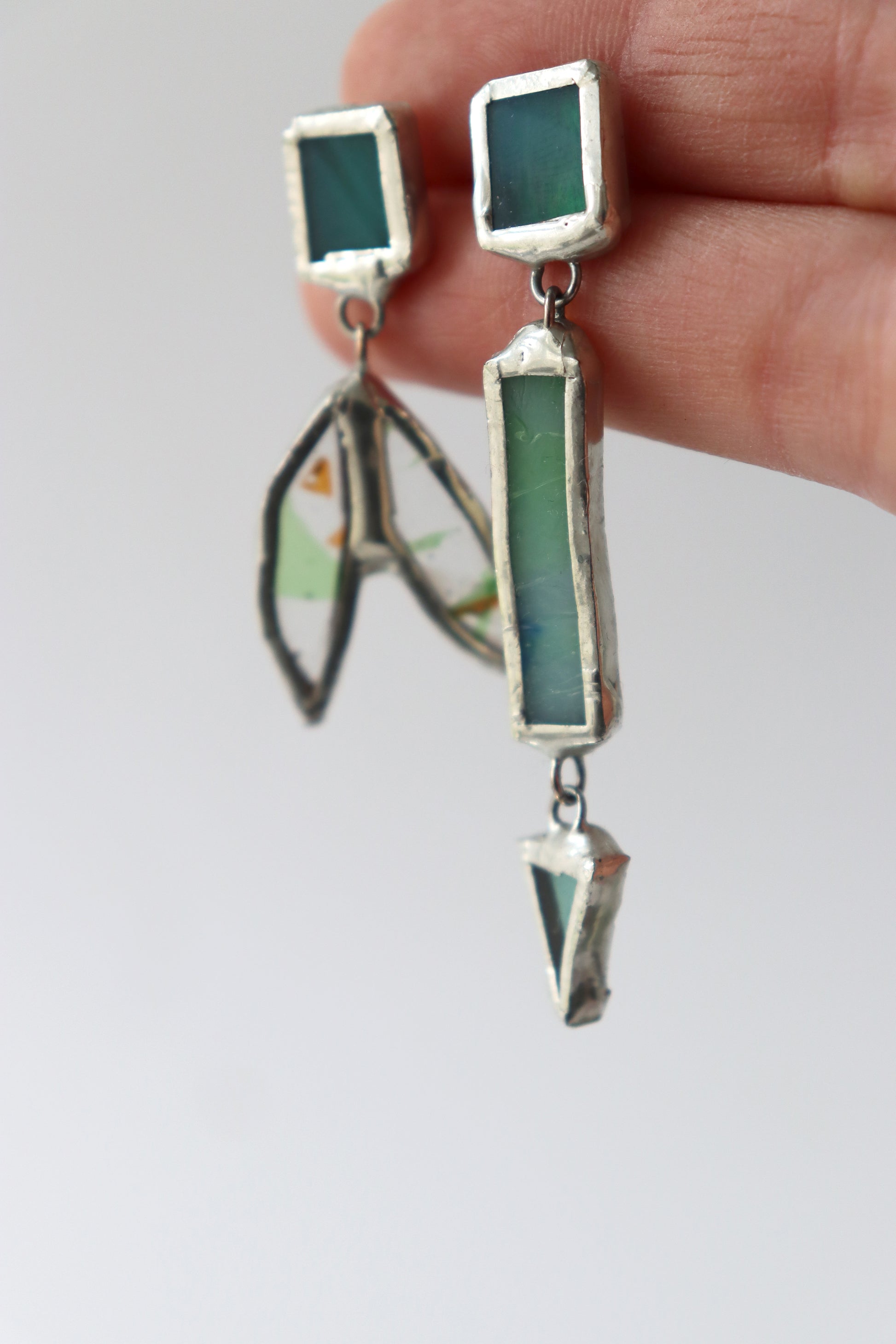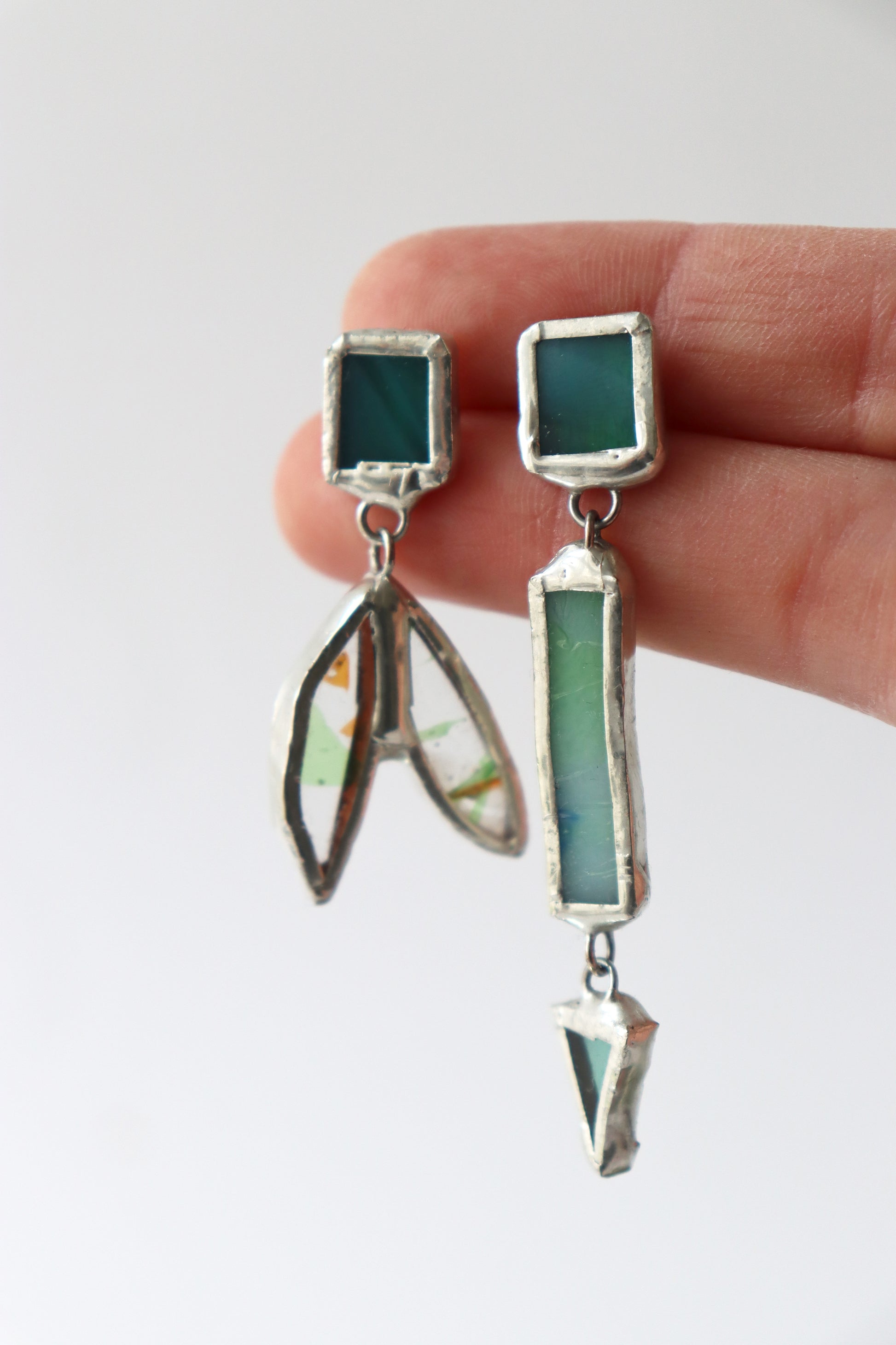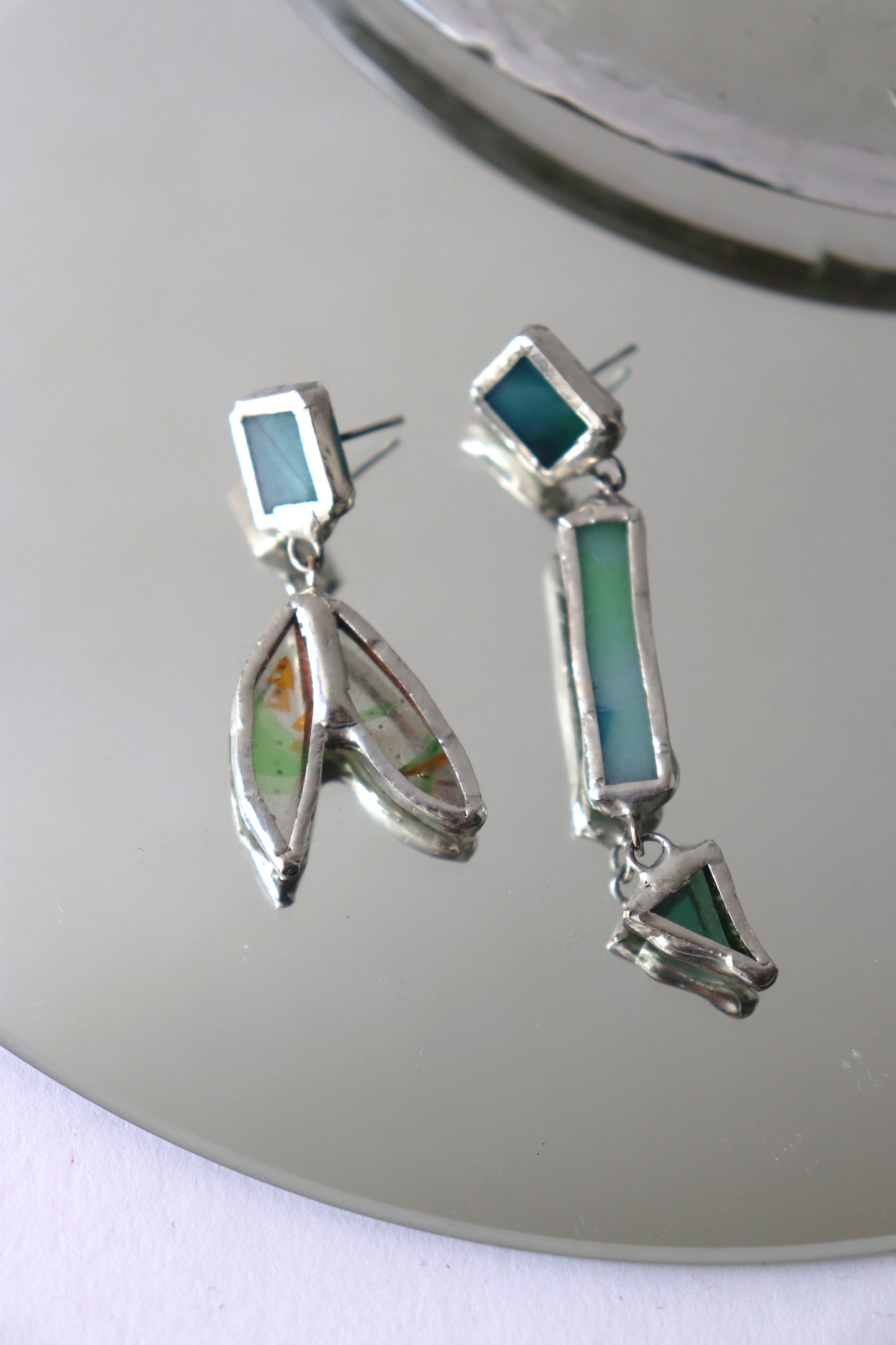 Glass is covered in lead-free solder with nickel free metal earring posts and butterfly backing
