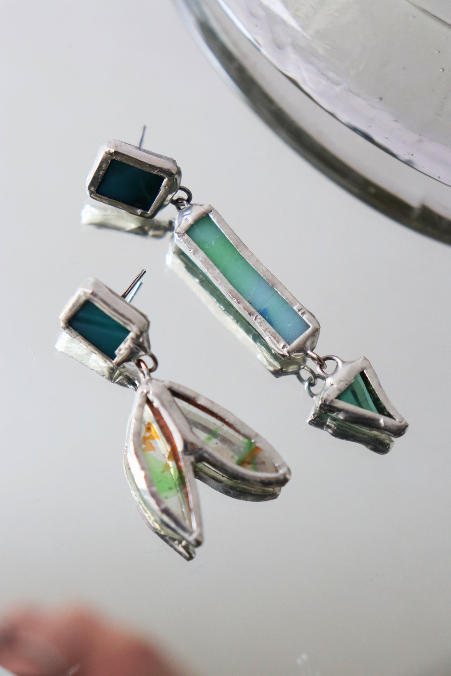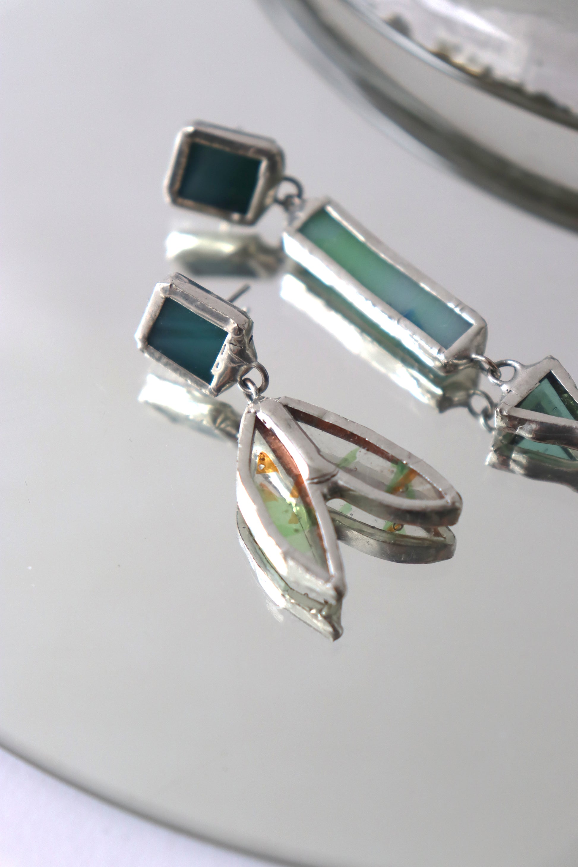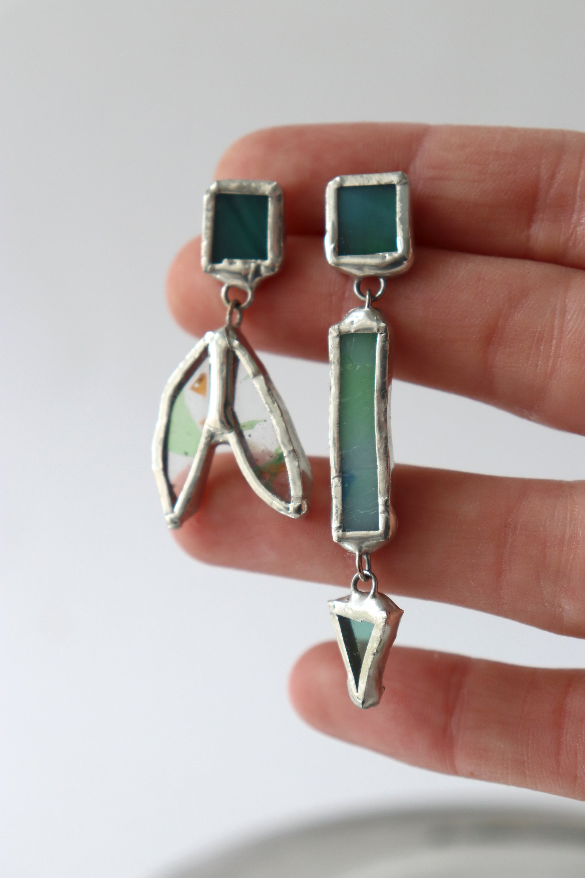 Glass is covered in lead-free solder with nickel free metal earring posts and butterfly backing