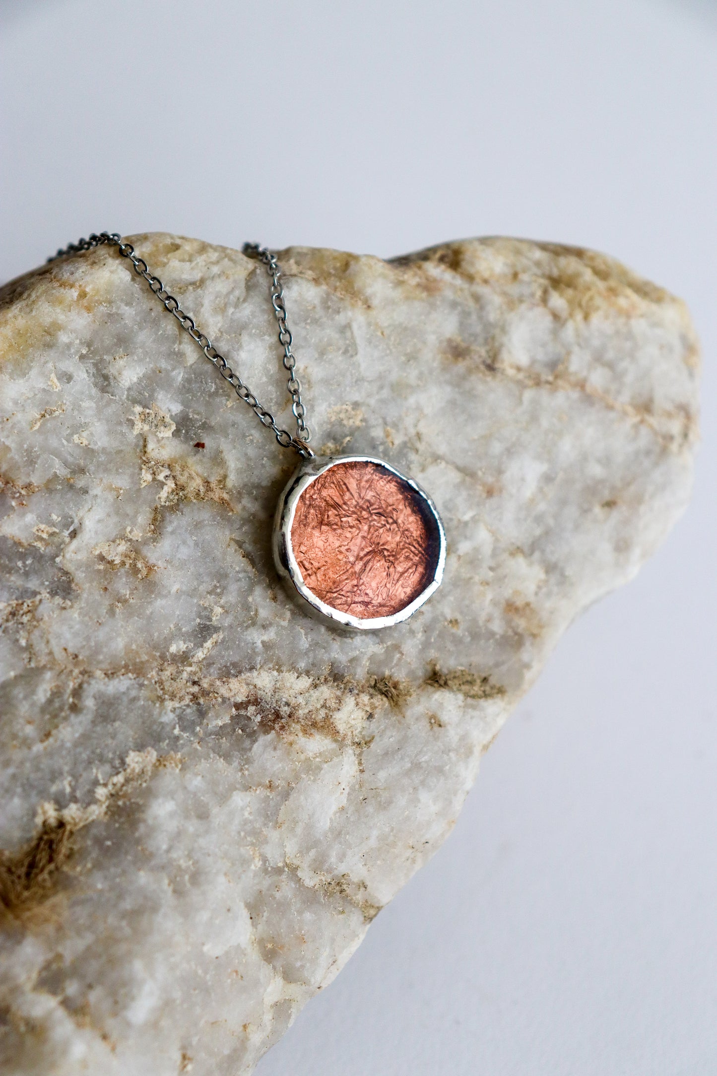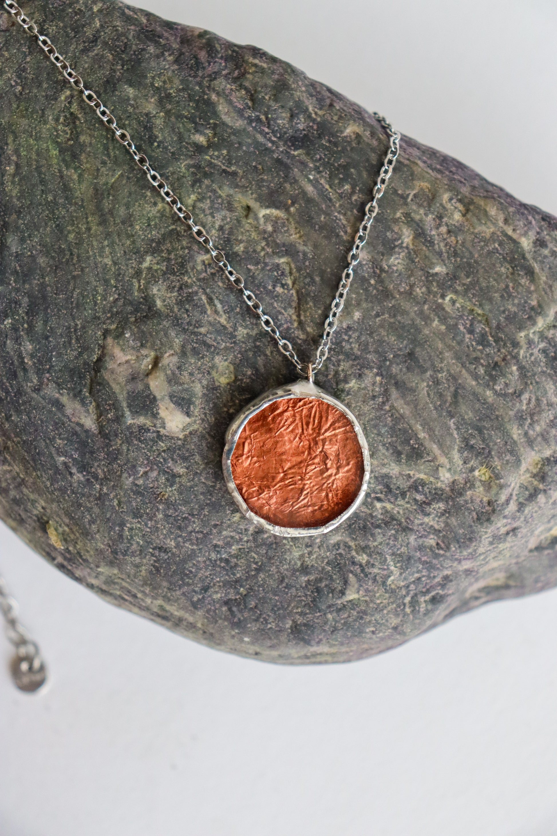 Glass is covered in lead-free solder with stainless steel chain