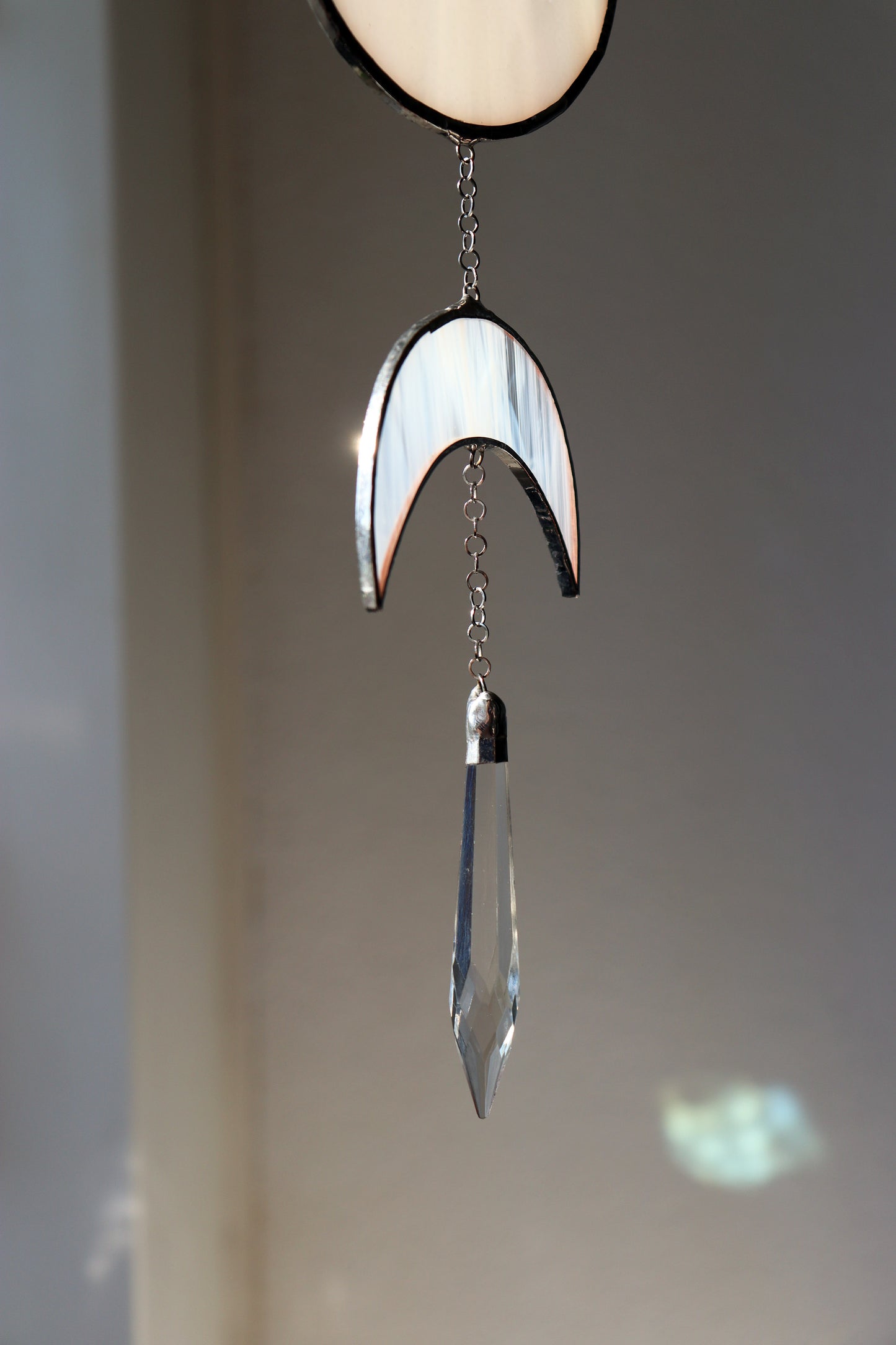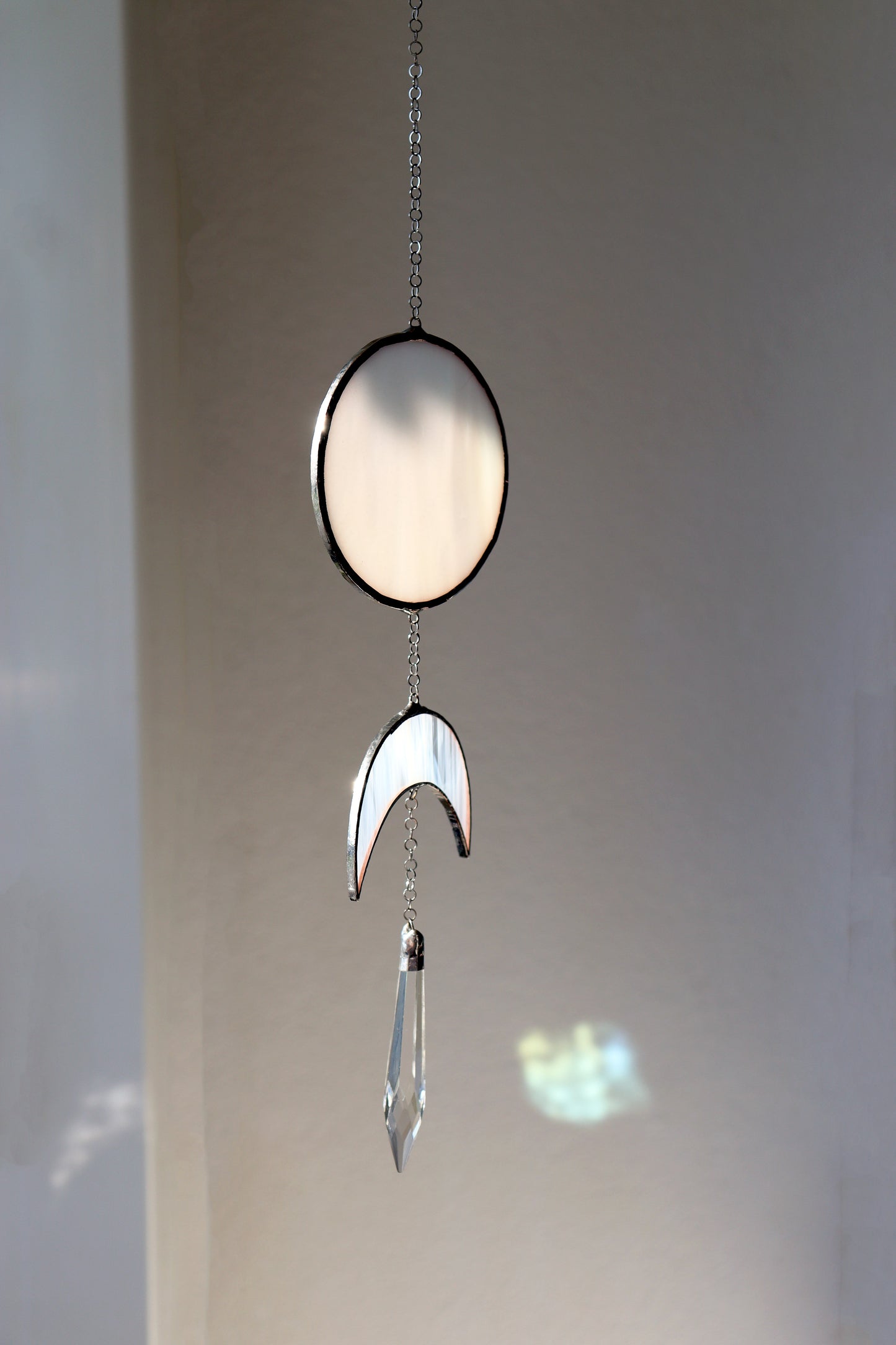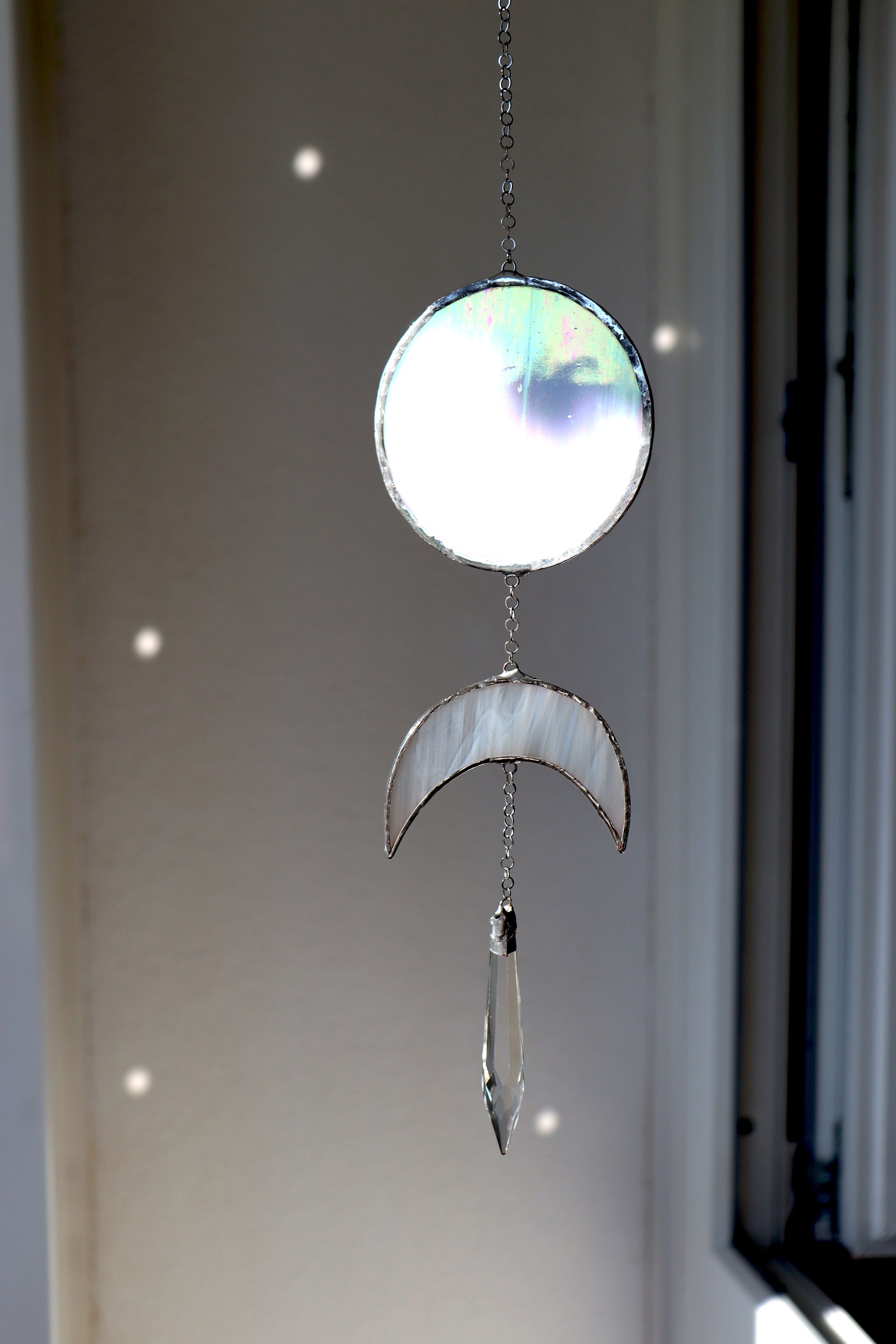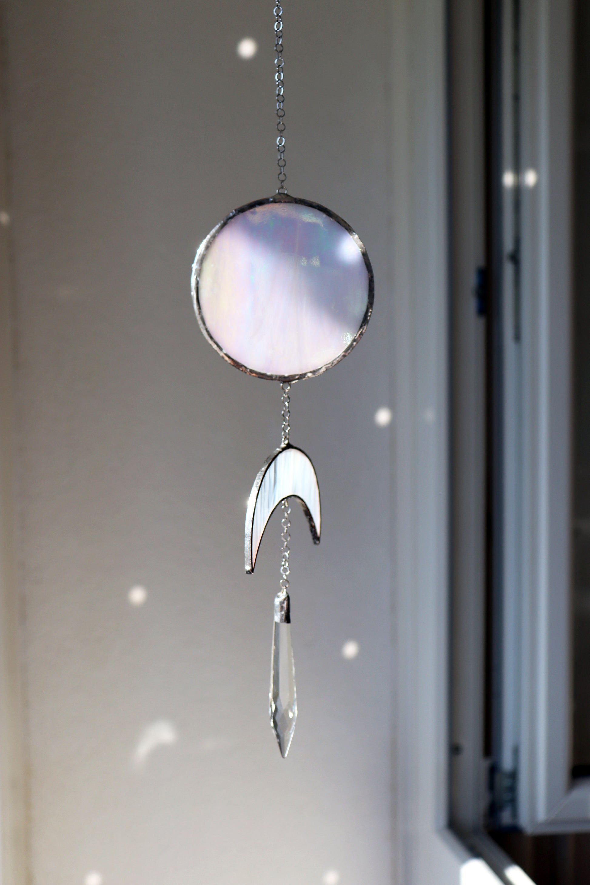 Suncatcher is made with two type of glass with prism on the bottom. The upper circle part is iridescent on one side and white on the other.