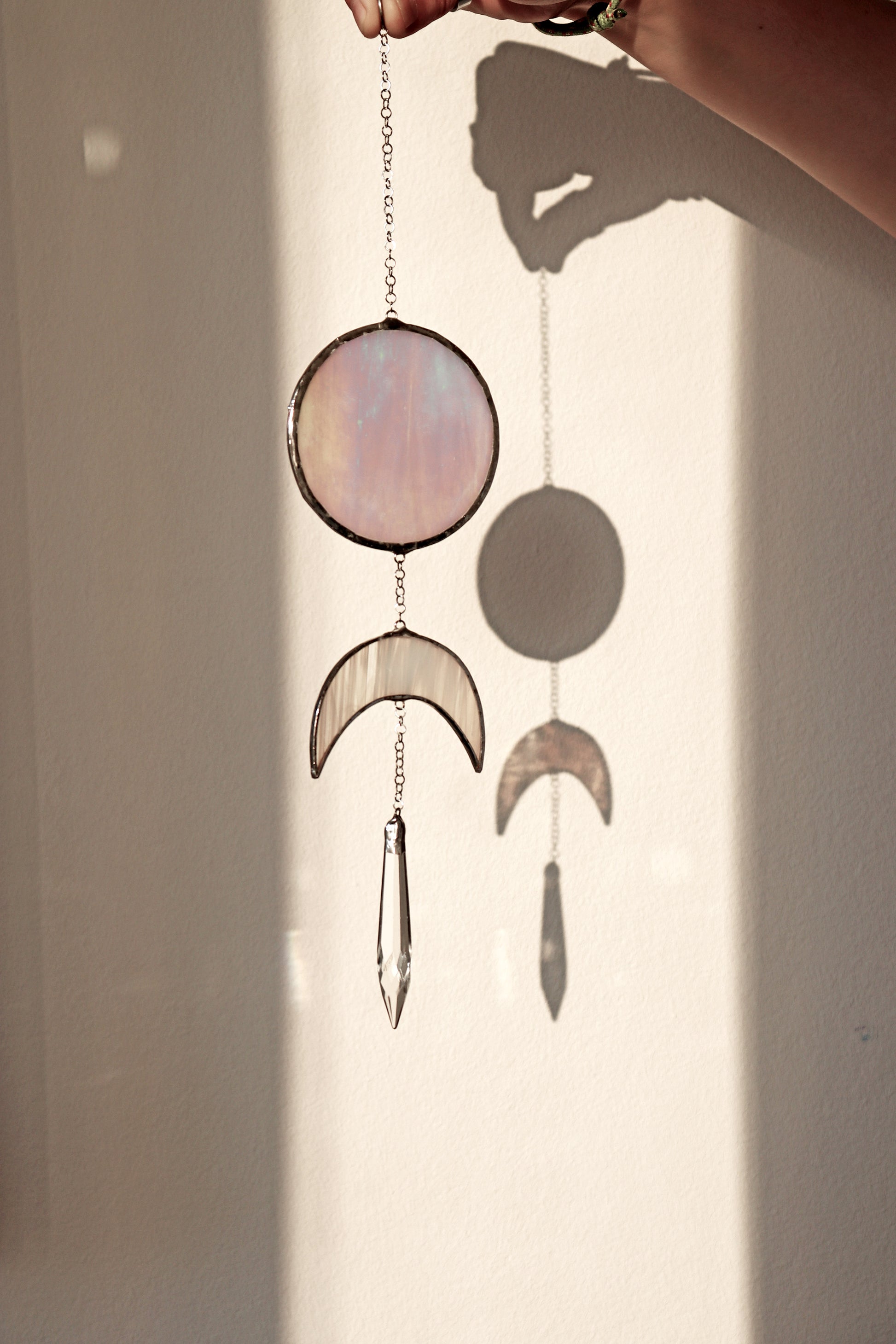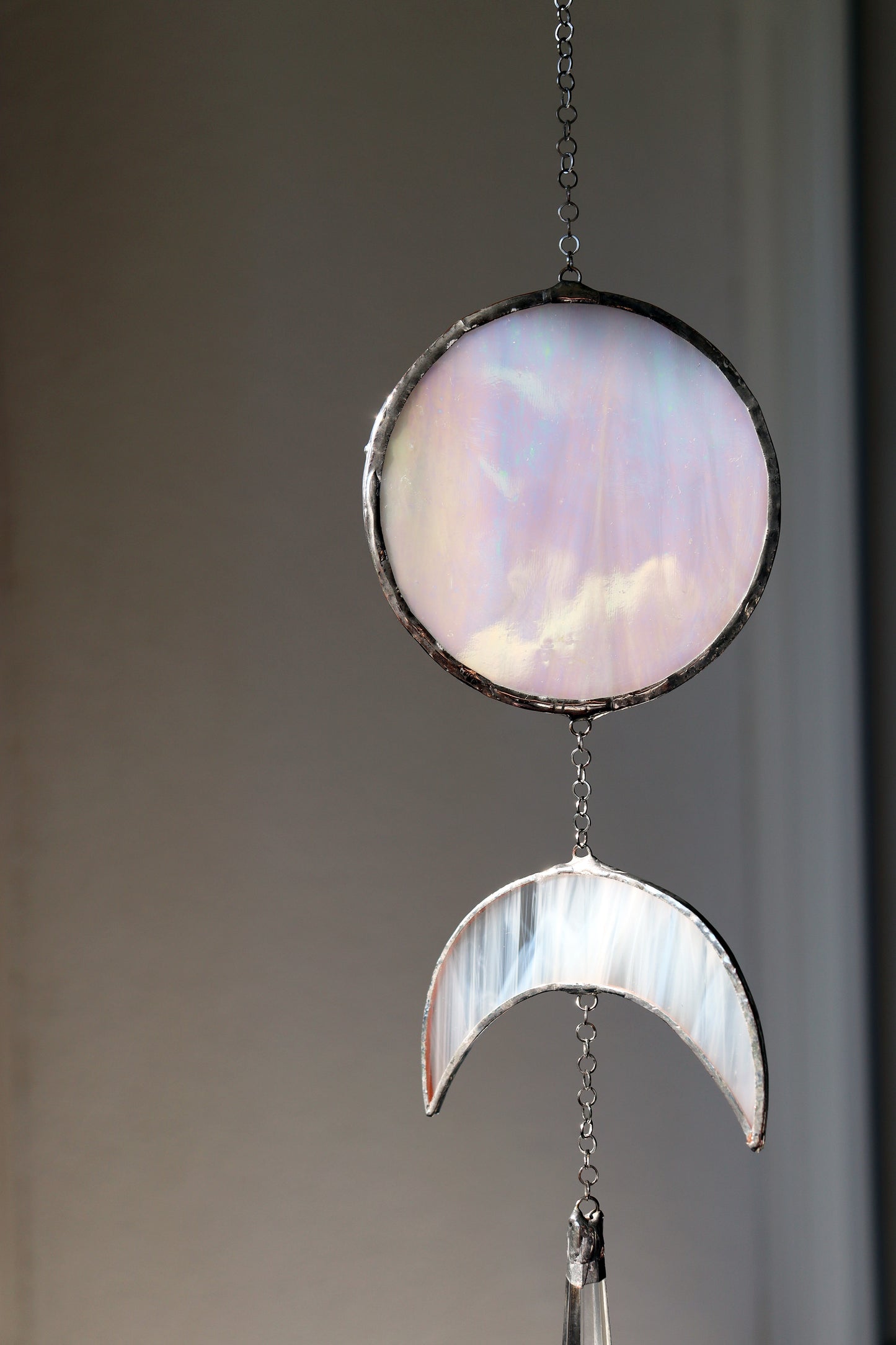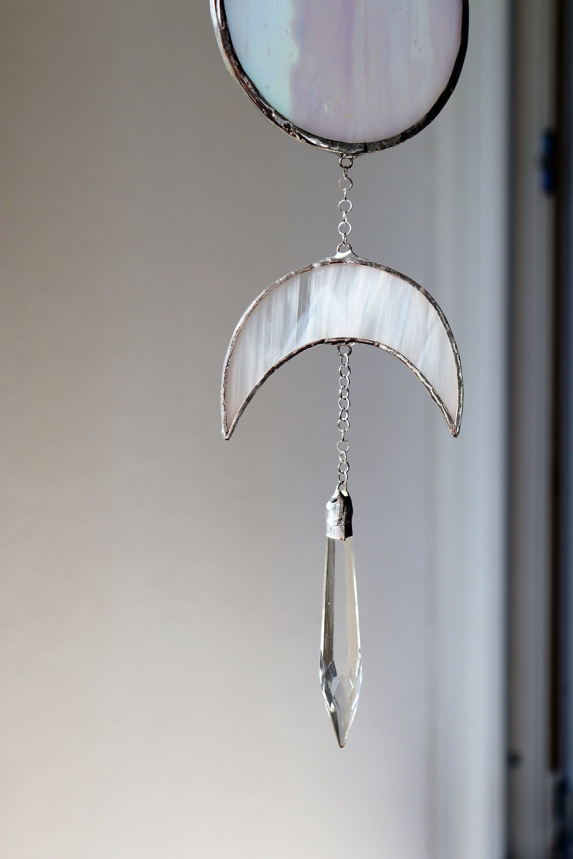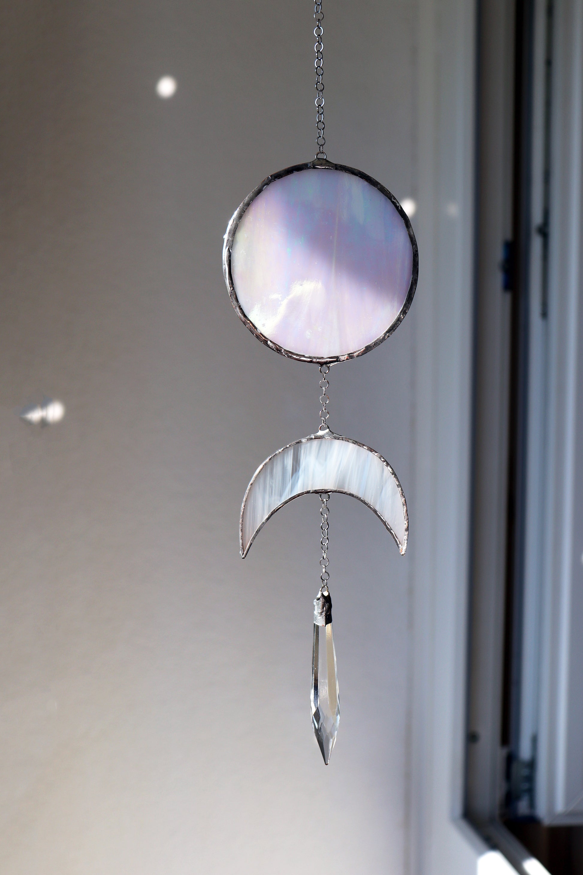 Suncatcher is made with two type of glass with prism on the bottom. The upper circle part is iridescent on one side and white on the other.